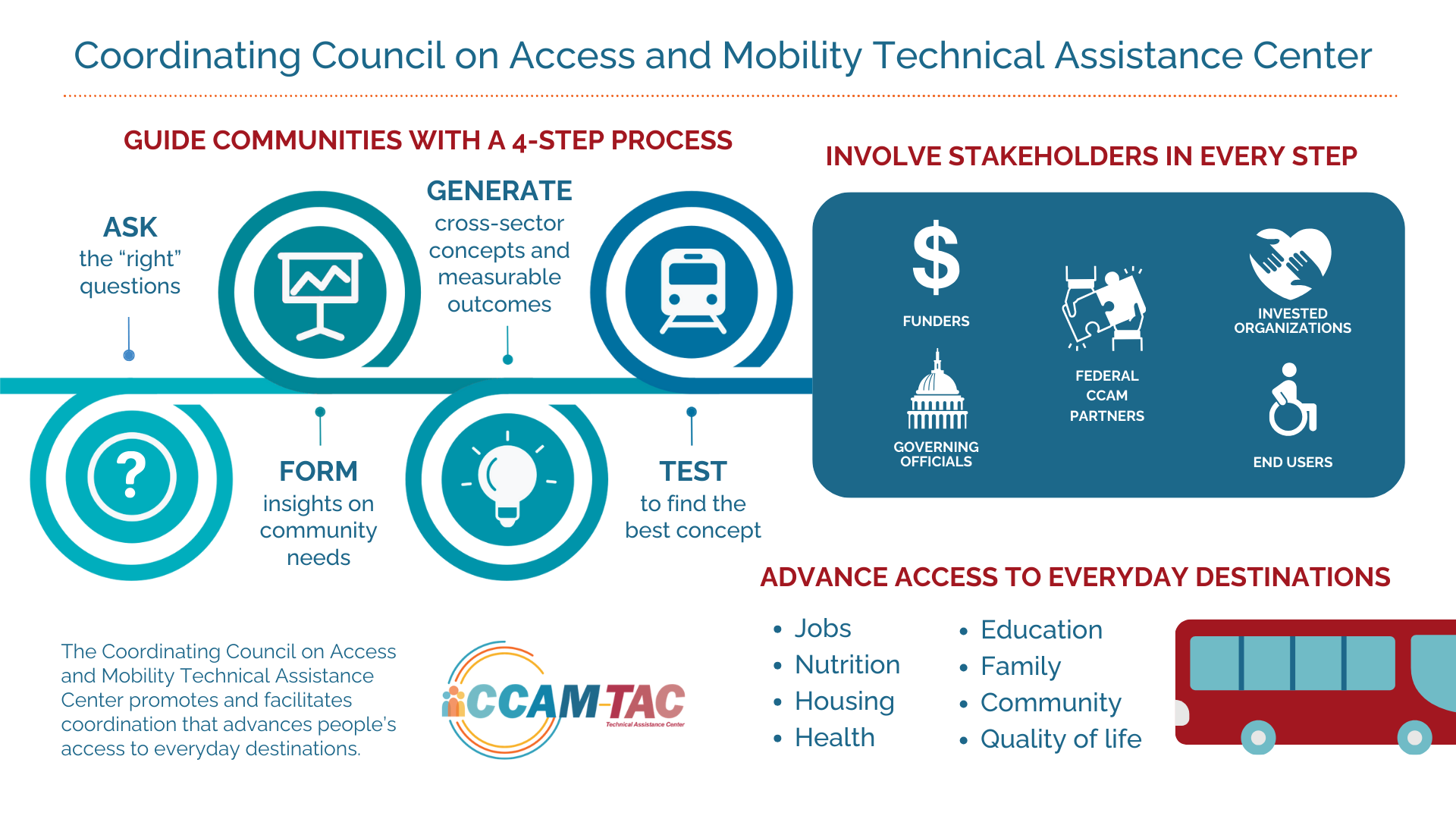 The Community Transportation Association of America (CTAA) is hiring a Program Associate to support the Coordinating Council on Access and Mobility Technical Assistance Center (CCAM TAC). This role is a unique opportunity to impact the coordination of over 130 federal programs across 10 different departments.