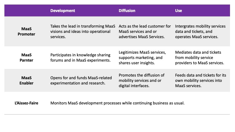 The “MaaS partner” role is closely linked to the “public-private” development scenario. During the development phase, the public organization “participates in knowledge sharing forums and in MaaS experiments.” During the diffusion phase, the public organization “legitimizes MaaS services, supports marketing, and shares user insights and data,” and during the use phase it “mediates data and tickets from mobility service providers to MaaS services.”
